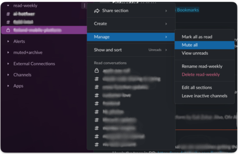 I’m mainly using this method for read-weekly. Every Friday, I have a scheduled 15-minute meeting to browse them. I unmute, read them, and mute again.