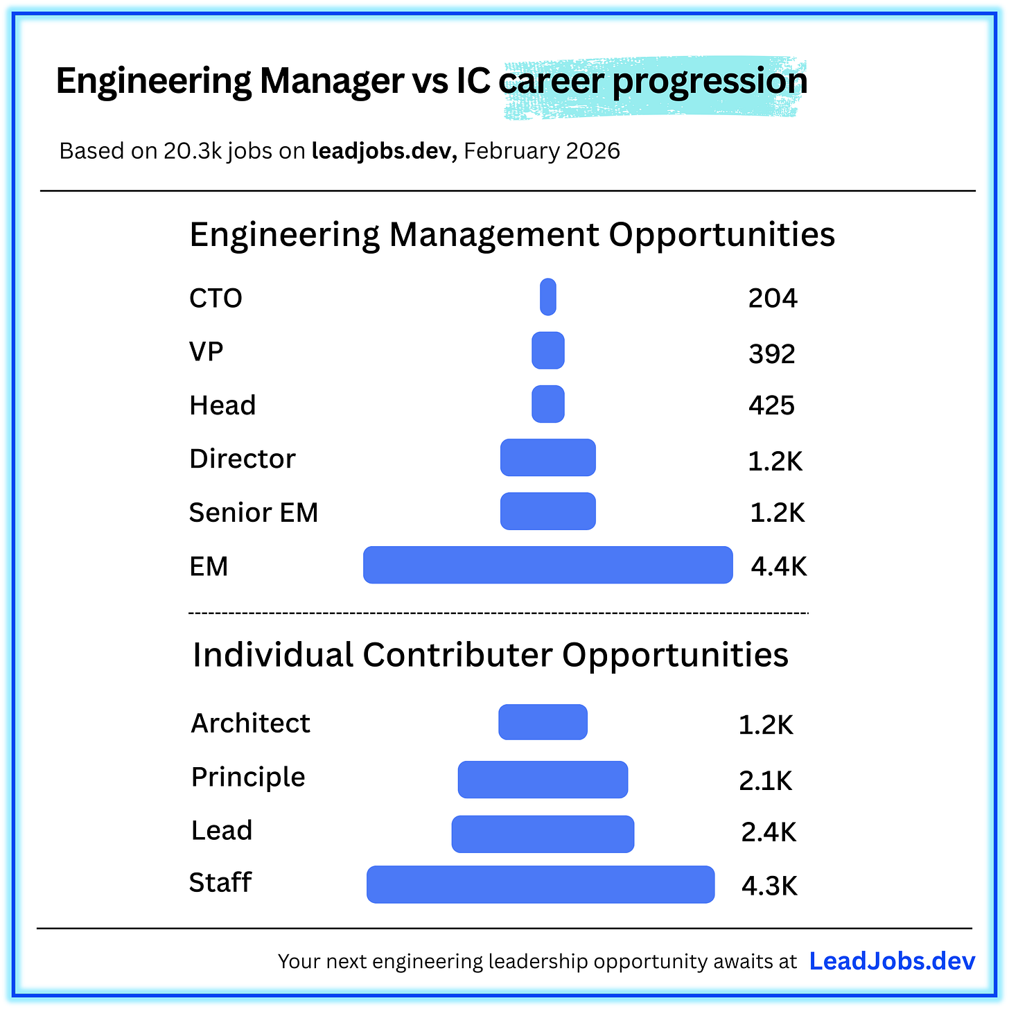This means there are fewer Director and VP roles to grow into (and much less Senior EM ones). You can be a great EM for years and find yourself stuck.