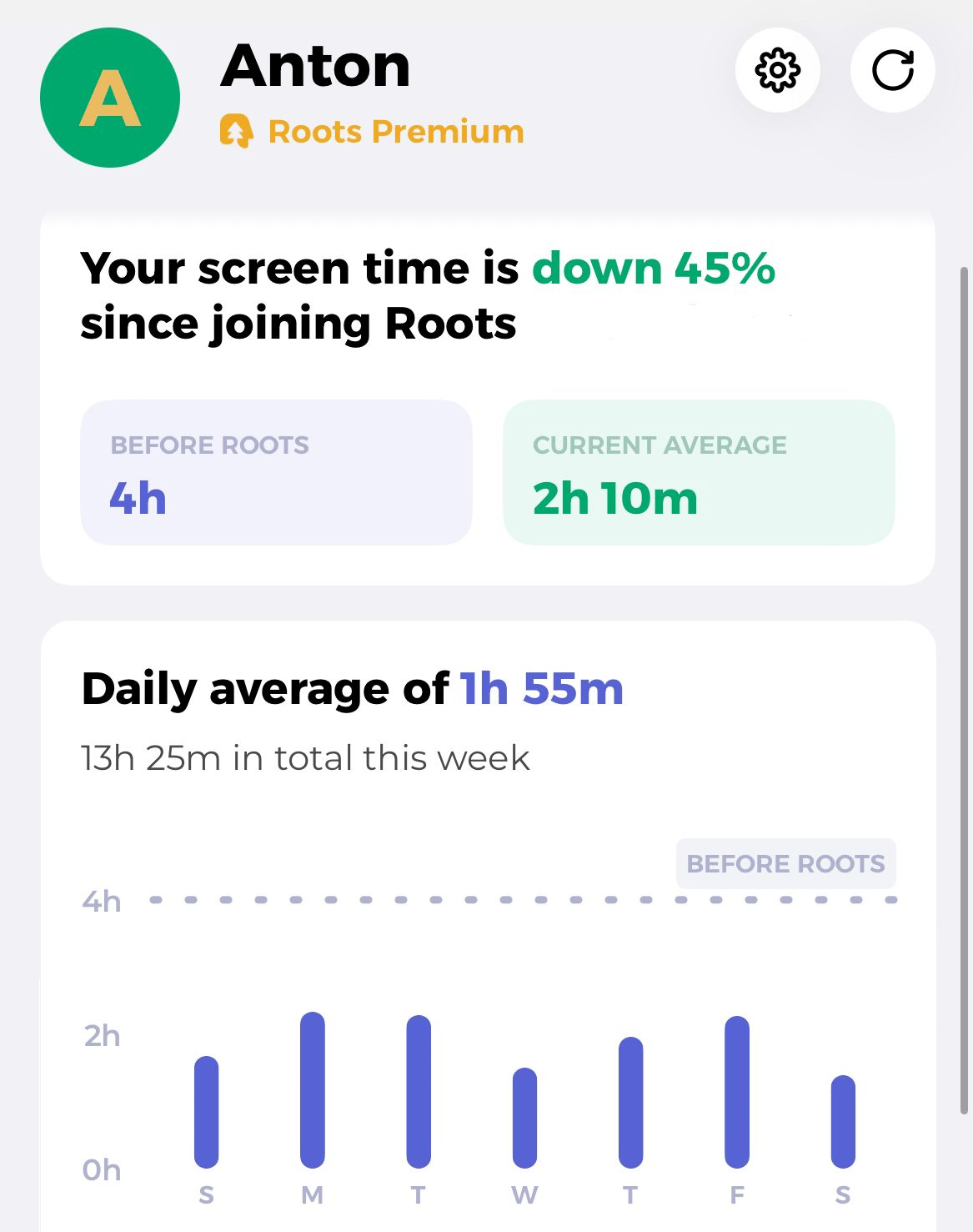 Our biggest time-spender is our phone - 4:30 hours each day on average. I was just a little better, with 4 screen hours per day.