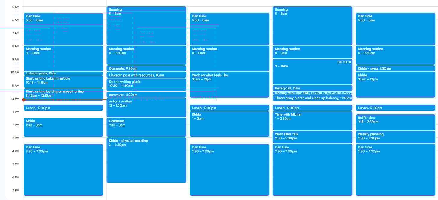 I plan to work 4-5 hour days. This is what my calendar currently looks like (Dan is my son). 1.5-2 hours every morning for a slow routine, and ending my days at 15:30 to pick him up.
