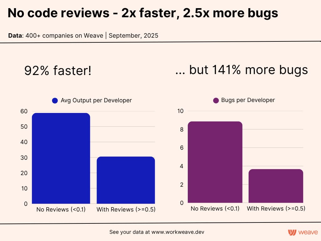 Even accounting for higher productivity, that’s 25% more bugs per expert hour of work. So yes, skipping reviews makes you faster. But you’re also shipping significantly buggier code.