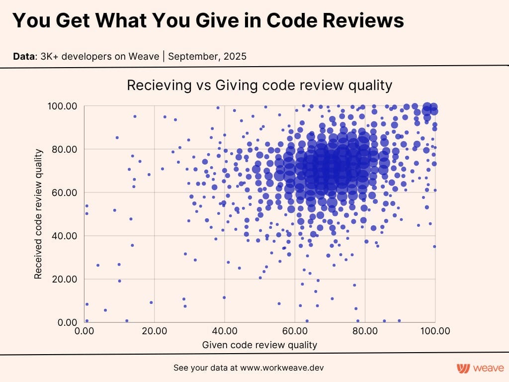 For each code review, we measure review quality based on depth of engagement, clarity of communication, and practicality of feedback. The average review score is ~75.